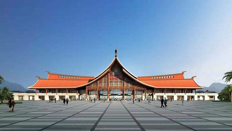 中老铁路琅勃拉邦站,位于老挝著名古都和佛教中心琅勃拉邦,站房遵循“人间净土,上寮古都”的设计主题,总建筑面积约8000平方米,设2站台4线,最高聚集人数1200人次,工程含双曲面“卅”字型、高差约14米的坡屋面结构,是全线最具特色、造型最为复杂的站房工程。