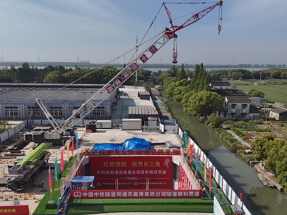 中国中铁旗下中铁隧道局施工的汾湖隧道是通甬高铁全线控制性工程,位于浙江省嘉兴市嘉善县和江苏省苏州市吴江区,跨越两省省界,全长3732米,其中盾构段2420米。隧道设计为单洞双线,采用盾构法+明挖法施工,盾构机为1台14.82米的国产超大直径泥水平衡盾构机“红船号”。